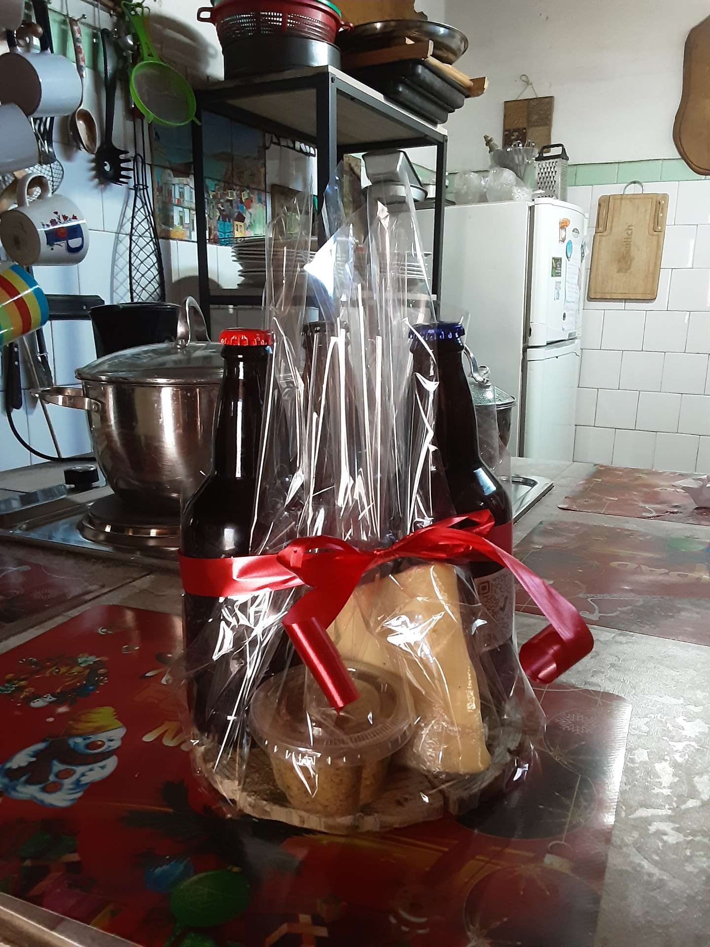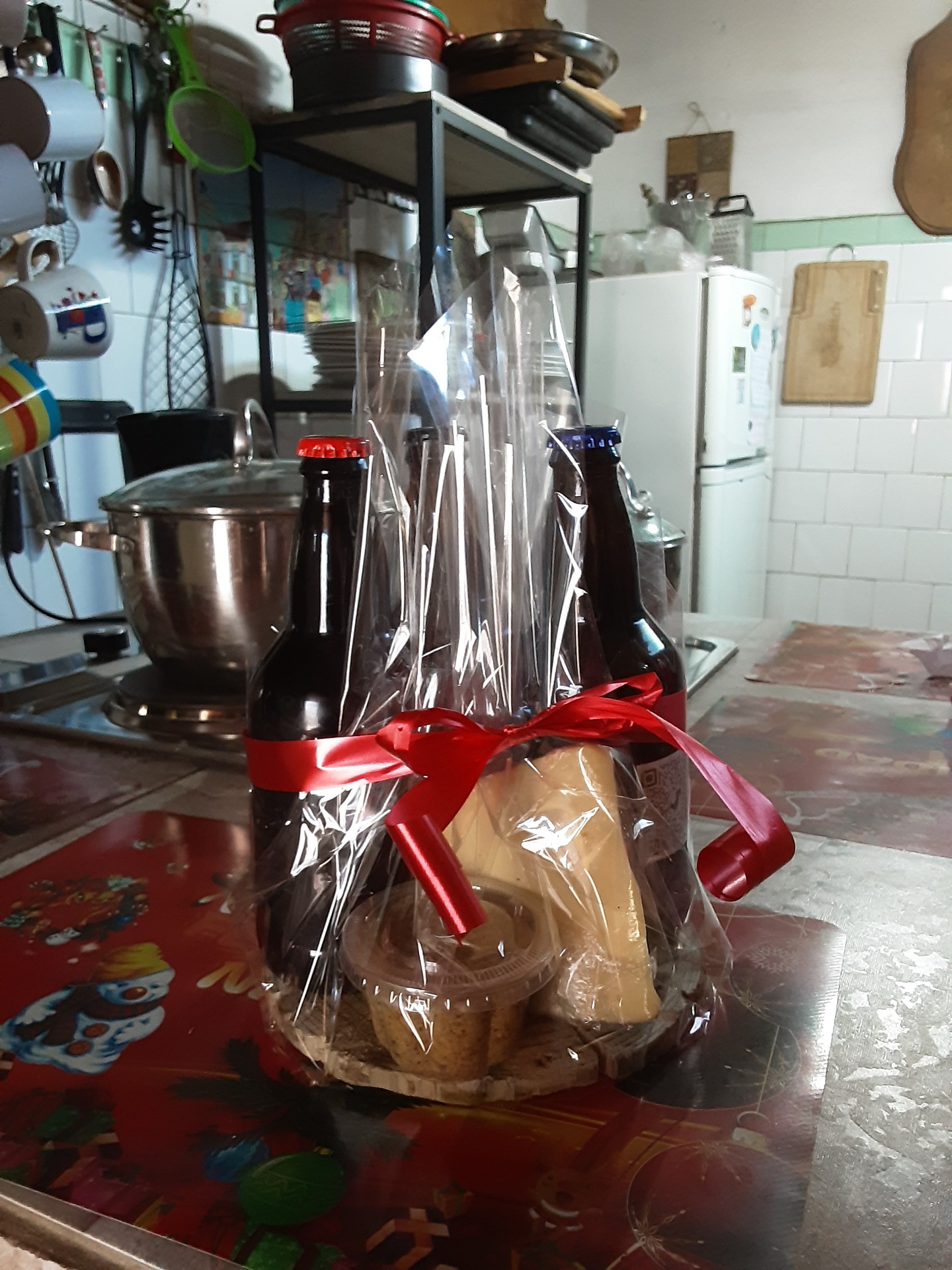 PROMOCIÓN DE NAVIDAD PAQUETE CERVECERO, INCLUYE 3 CERVEZAS DE MEDIO LITRO EN LAS VARIEDADES STOUT, ÁMBAR ALE Y GOLDEN. ADEMÁS 100 g. DE MOSTAZA ARTESAL A LA CERVEZA ORIGINAL Y 200g DE QUESO MANTECOSO MAGALLÁNICO, TODO MONTADO EN UNA RODELA DE PINO INMPREGNADA EN ACEITE DE OLIVA. (PRECIO $10.000.)